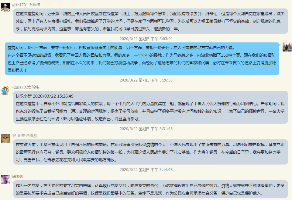 3月15日,习近平总书记给北京大学支援湖北医疗队全体“90后”党员回信,对新时代的中国青年深情点赞,同时提出殷切期望。党支部积极号召全体党员结合疫情期间,自己积极参与抗疫、克服困难、刻苦学习、增强本领的经历,分享自己的感悟。