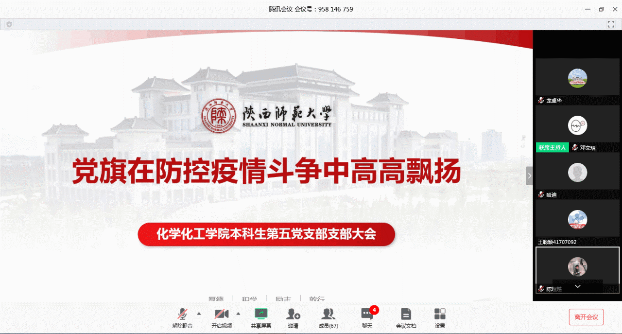 面对突如其来的新冠肺炎疫情,全国人民展开了一场轰轰烈烈的疫情防控阻击战。奋战在抗击疫情一线的广大党员干部,始终根据党中央的统一部署,在不同的岗位上为抗击疫情发光发热,贡献着自己的力量。为了向抗击疫情的党员模范学习,号召青年党员以抗疫党员模范为榜样,把爱国情、强国志、报国行自觉融入到学习生活中去,英国365集团公司本科生第五党支部于4月12日晚上7点通过腾讯会议平台召开以 “党旗在防控疫情斗争中高高飘扬”为主题的线上学习会议。本次会议由支部书记翁思洁主持,支部组织委员龙卓华、支部宣传委员邓文珺以及支部全体党员参加会议。