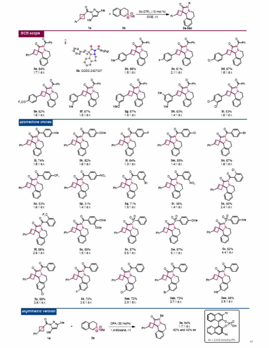 通过对反应条件进行筛选,作者发现在Sc(OTf)3催化下,使用DCE作为反应溶剂,在常温条件下反应能够以87%的收率,1.7:1的非对映选择性得到螺[3.4]辛烷产物。随后,作者首先对双环[1.1.0]丁烷(BCB)底物范围进行了考察(见图3),该反应对于各种各样取代基的双环[1.1.0]丁烷(BCB)具有良好的适用性,均能以中等至良好的收率得到目标产物。紧接着,作者考察了偶氮甲碱亚胺的底物适用范围(见图3)。该反应具有良好的适用性,均能以中等至良好的收率得到目标产物。在成功建立了BCBs与偶氮甲基亚胺的反应后,作者希望能够实现该反应的不对称螺环化反应。当使用BINOL衍生的CPA作为催化剂,1,4-二氧杂环己烷作为溶剂时(见图3),能以66%的产率,1.7:1的d.r.值,82%/63% ee得到目标产物3a。
