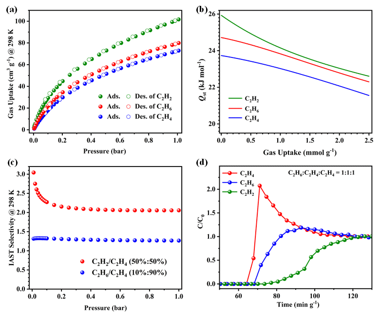图3. (a)Quin-Zn-Ad-BTC在298 K温度下对C2H2、C2H4和C2H6的吸附等温线。(b)三种气体的吸附焓(Qst)。(c)体积比为10%/90%的C2H6/C2H4和50%/50%的C2H2/C2H4混合气的IAST。(d)在1 mL min-1流速下,C2H2/C2H4/C2H6体积比为1/1/1,三组分混合气的穿透曲线。