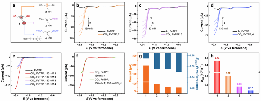 图4(a)234的分子结构。二氧化碳条件下0.5 mM FeTPP随(b)2、(c)3和(d)4浓度增加的线性循环伏安曲线图。(e)二氧化碳条件下加入130 mM 1234时0.5 mM FeTPP的线性循环伏安曲线对比图。(f)130 mM质子源1与130 mM质子源2和130 mM Et3N同时存在时0.5 mM FeTPP线性循环伏安曲线对比图。(g)加入130 mM 1234时催化电流与起峰电位的对比图。(h)0.5 mM FeTPP加入1234之后的催化速率常数对比图。