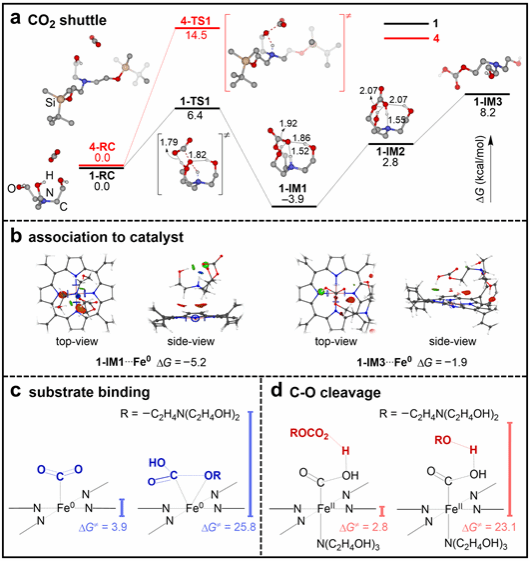 为了更好地理解1在提高FeTPP电催化CO2RR中的关键作用,我们进行了密度泛函理论(DFT)计算来阐明催化过程。首先,研究了1和CO2之间的反应。1可以捕获一个CO2分子生成烷基碳酸氢酯1-IM1,活化自由能垒仅为6.4 kcal/mol、放热自由能为−3.9 kcal/mol。接着,我们研究了CO21的结合物和FeTPP之间的相互作用。通过相互作用区域指示(IRI)分析可知,1-IM11-IM3与Fe0之间存在明显的范德华力和氢键相互作用。综上这些结果表明,1可以作为shuttle捕获二氧化碳分子,并将其带到催化活性位点。最后,研究了底物分子在催化活性Fe0位点的活化过程。计算结果表明,催化底物以游离CO2分子的形式与催化剂反应,结合自由能垒为3.9 kcal/mol。1除了起shuttle作用之外,当碳酸氢酯1-IM3作为质子源时,C−O断键的自由能垒可以降低至2.8 kcal/mol。
