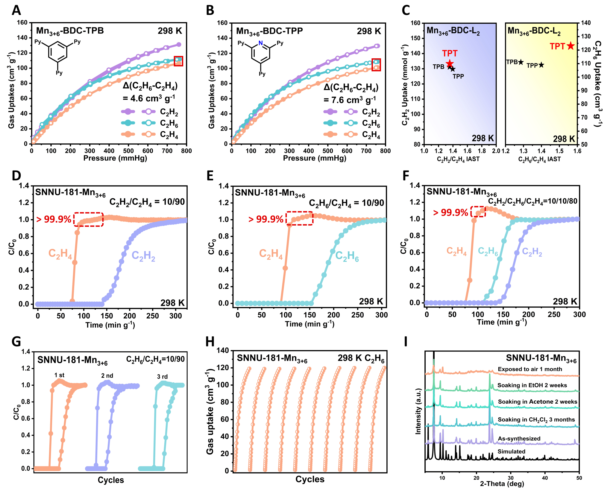 进一步使用含不同N原子数目的分区体构筑了系列Mn3+6-BDC-L2 pacs MOFs,实验结果表明(图3A-C),Mn3+6-BDC-TPT(每个TPT中含有3个未配位的N原子)最具吸附分离潜力,证明了精细优化N位点可有效提升材料的吸附分离性能。动态穿透实验表明,SNNU-181-Mn3+6可高效分离C2H2/C2H6/C2H410/10/80v/v/v)三元混合气体(图3F)并提供出色的C2H4产率(1.77 mmol g-1),比得上许多已报道的基准C2H2/C2H6选择性MOFs。循环测试和稳定性测试证明了SNNU-181-Mn3+6的可循环性和稳定性(图3G-I)。