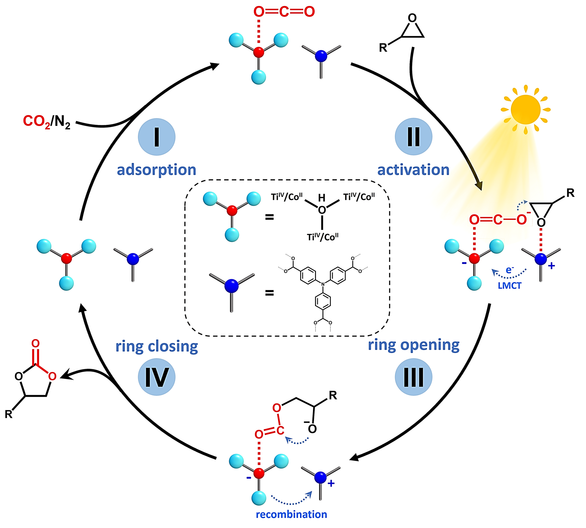 基于理论数据和实验结果,作者提出了SNNU-92-Co6-xTix MOFs的催化机理(图7)。首先,烟道气中的CO2优先吸附在SNNU-92-Co6-xTix MOFs中的金属簇附近。在光照条件下,NTB3-产生的光生电子通过配体到金属的电荷转移(LMCT)途径转移到金属簇上,*NTB3-随后吸附环氧化物。然后,Ti(IV)促进了反应中CO2的活化和电荷利用,*CO2攻击环氧化物的弱侧碳进而开环。最后,整个环加成反应随着框架中电子的重组和环的闭合而完成。