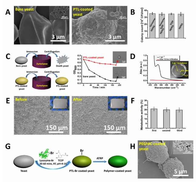 图4. PTL封装酵母细胞以实现对其保护、表面功能化和表面固定等多种用途。(A) 空白酵母细胞和PTL包裹的酵母细胞对比;(B) 在不同缓冲液中培养出的酵母活性对比;(C) PTL包裹的酵母细胞对外界有毒物质(溶细胞酶,Zymolyase)的抵抗示意图及在溶细胞酶存在下的抵御能力测试;(D) 评价PTL膜阻隔溶细胞酶能力的Zymolyase透过性测试;(E) 用PTL方法将活酵母层固定在硅片上并代谢葡萄糖的反应过程前后对比;(F) 循环使用固定化酵母层代谢葡萄糖的反应活性测试;(G, H) 通过表面引发ATRP法在PTL包裹的酵母细胞表面接枝聚乙二醇甲基丙烯酸酯 (PEGMC)聚合物刷。