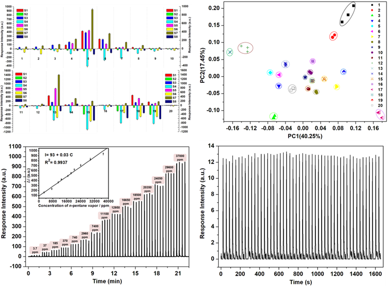 饱和烷烃是一类重要的信号物质,在消化系统、呼气系统某些疾病,特别是肺癌的早期诊断,油气资源的普查勘探中具有重要的意义。然而,饱和烷烃化学性质稳定,也缺乏光电活性,这就使得其原位在线高灵敏探测变得十分困难。针对这一挑战,房喻教授小组创造性将非平面荧光单元引入薄膜结构,制备了富含“分子通道”的荧光薄膜阵列,利用内聚能差异,薄膜通道的体积选择、极性选择,以及传感单元荧光量子产率的溶剂依赖性等,在自行搭建的系统上实现了对饱和烷烃的气相高灵敏选择性快速识别和检测。对肺癌标示物正戊烷的检测灵敏度可达3.7 ppm以下,系统响应速度小于1 s,且可实现稳定重复使用,有望在肺癌早期诊断中获得应用。该工作近期在化学领域顶级期刊《Chemical Science》上在线全文发表。论文第一作者为英国365集团公司2016级博士研究生祁彦宇同学,合作者包括硕士研究生徐文君、康蕊,本科生丁南南,物理学与信息技术学院硕士研究生王烨蕾,以及西安交通大学的何刚教授等,通讯作者为房喻教授。
