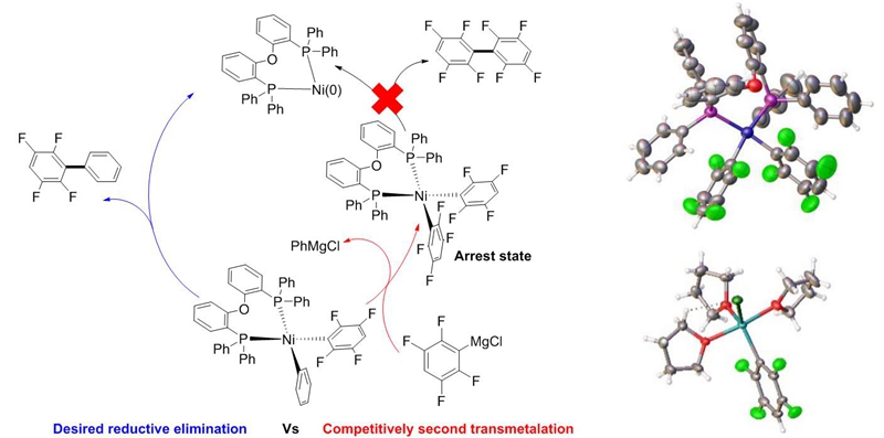 得益于氟原子的“负氟效应”,他们成功地分离得到催化剂的终止态,机理研究表明,该化合物来源于体系中过量格氏试剂对二价镍复合物中间体的竞争性二次转移金属化(芳基交换)。这是Kumada偶联反应问世近50年来首次证实这种类型的芳基交换存在。对于非氟代芳基格氏试剂参与的Kumada偶联,二次转移金属化极可能是格氏试剂自身偶联副产物产生的主要途径。目前,自身偶联副产物污染仍然是影响Kumada偶联应用于工业化生产的主要原因之一。黄治炎老师课题组的研究结果为设计新的催化体系抑制自身偶联反应,减少副产物生成具有重大的指导意义。该系统性的研究工作以全文形式发表在《ACS Catalysis》,第一作者是2014级硕士研究生王俊亚(http://pubs.acs.org/doi/pdf/10.1021/acscatal.7b02618)。