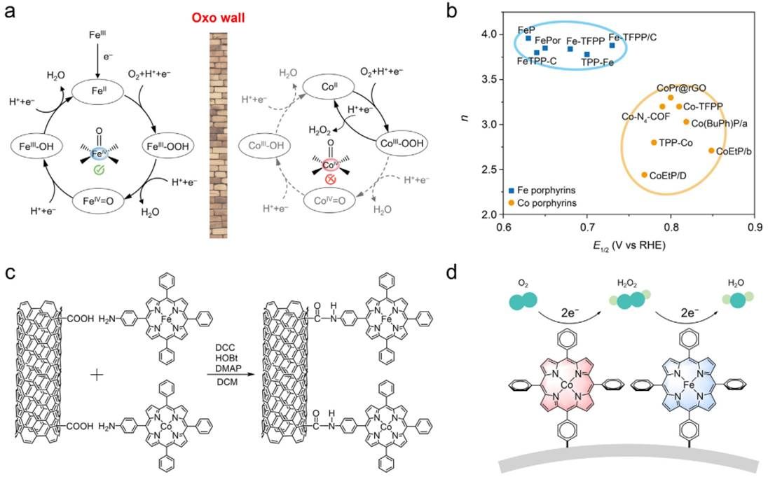 图1. 催化剂设计策略示意图。a) 氧墙前后金属位点上的ORR机理。b) 典型Co卟啉和Fe卟啉的ORR电催化性能。c) FeP‑CoP/CNT的合成过程。d) 在双位点上实现的2e + 2e ORR路线。