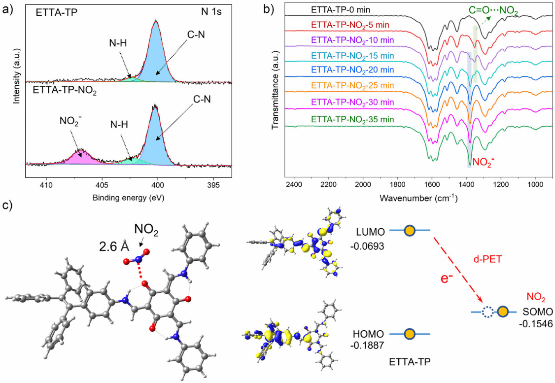 传感器对NO2优异的响应性能得益于ETTA-TP COF膜具有方形网格拓扑结构,其具有高度多孔结构以及较小的孔径,其比表面积高达753 m2/g,能促进传质及活性位点的充分利用,而其孔径约为0.6 nm,可以通过限域效应促进气体分子与框架材料的传感过程。通过红外光谱,XPS光谱,EPR光谱测试和理论计算证明了COF膜与NO2之间发生了光诱导电子转移过程(图4)。通过薄膜以及小分子对照实验证明了NO2的结合位点在羰基,含有羰基的小分子以及COF材料对NO2的荧光响应验证了该作用位点的普适性。理论计算表面羰基与NO2之间的静电相互作用有效驱动了光诱导电子转移过程,进而引起显著的荧光猝灭响应。本研究为发展具有快速响应、高灵敏度和原位在线监测能力的便携式气体传感器提供了新方法。